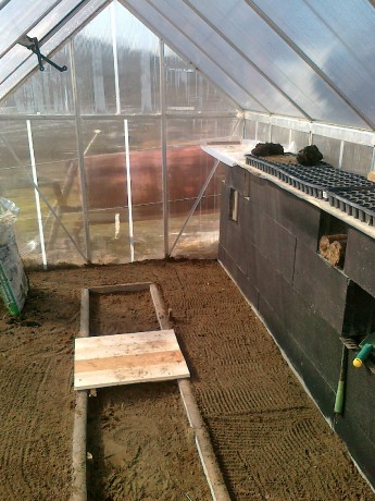 využitá celá plocha skleníku. Pohybujem sa nad rastlinami na drevenej podložke ležiacej na betónových koľajniciach (obrubníkoch za 39kč1m) a s absorbčnou stenou pohlcujúcou teplovodne a vyžarujúcou vnoci. Doizolované bublinkovou fóliou.